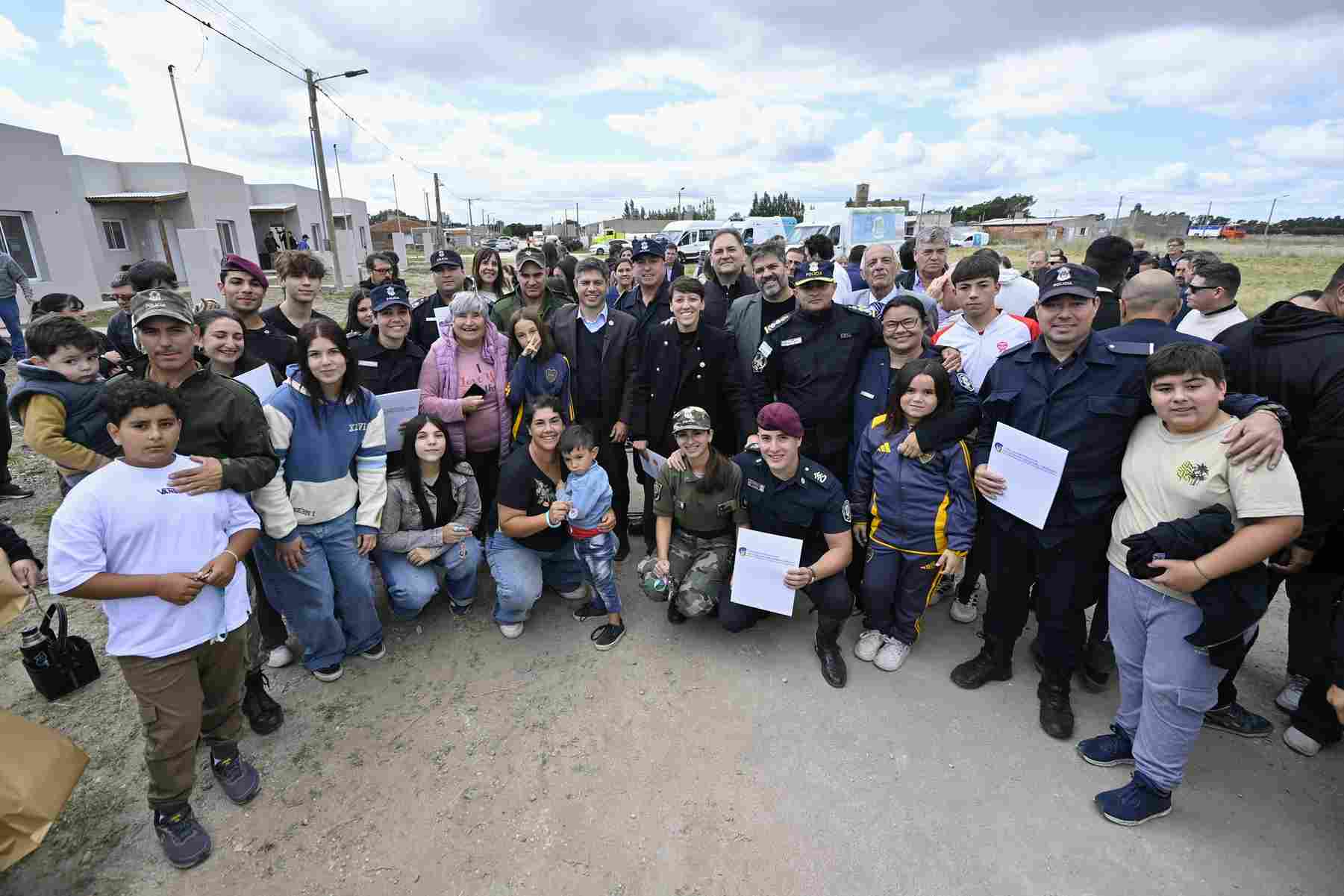 El gobernador de la provincia de Buenos Aires, Axel Kicillof, encabezó este miércoles el acto de entrega de viviendas destinadas a personal policial de la localidad de De la Garma, municipio de Adolfo Gonzales Chaves, donde además puso en funcionamiento una ambulancia de alta complejidad y una combi para transporte escolar. Fue junto a los ministros de Seguridad, Javier Alonso, y de Salud, Nicolás Kreplak; y la intendenta local, Lucía Gómez.